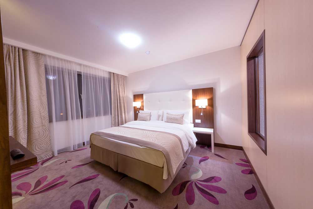 Pentru turiștii care doresc o călătorie de lux, hotelul nostru oferă 4 apartamente cu vedere la oraș și cu balcon propriu ,locul ideal în care dotările moderne pentru relaxare se îmbină perfect cu detaliile sofisticate . Saltelele premium king-size ( 180 x 200 ) , special achiziționate pentru confortul turiștilor noștri , cada cu jacuzzi cu vedere în cameră , dușul cu efect de ploaie răcoritoare și zona de relaxare dotată cu canapele confortabile , sunt doar câteva din dotările regăsite aici .
