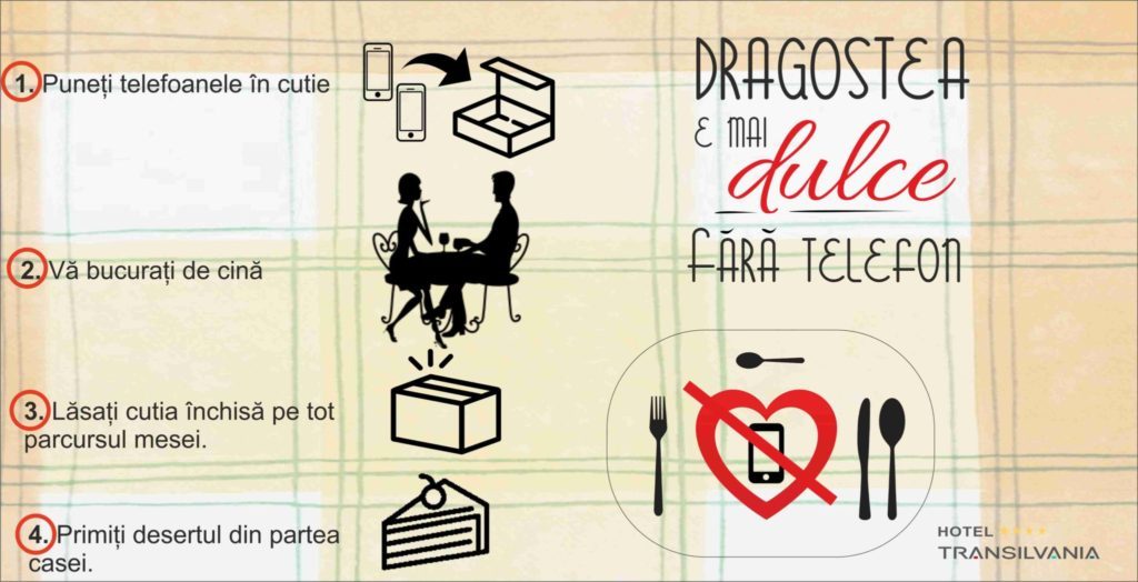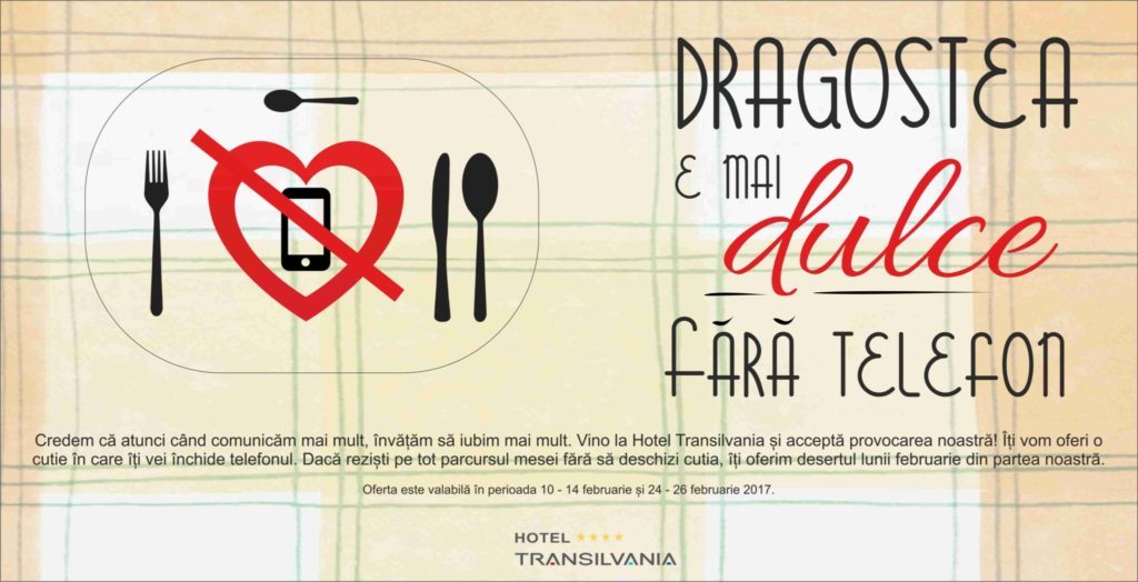 În februarie, luna dragostei, Hotel Transilvania lansează o provocare tuturor cuplurilor. În perioada 10-14 februarie și 24-26 februarie, adică în preajma sărbătorilor de Valentine’s Day și Dragobete, toți îndrăgostiții care vor servi cina la Hotel Transilvania sau la English Bar vor primi o cutie. Ei vor putea să-și închidă telefonul în acea cutie, iar cei care vor rezista întreaga cină fără să o deschidă vor primi desertul din partea casei.