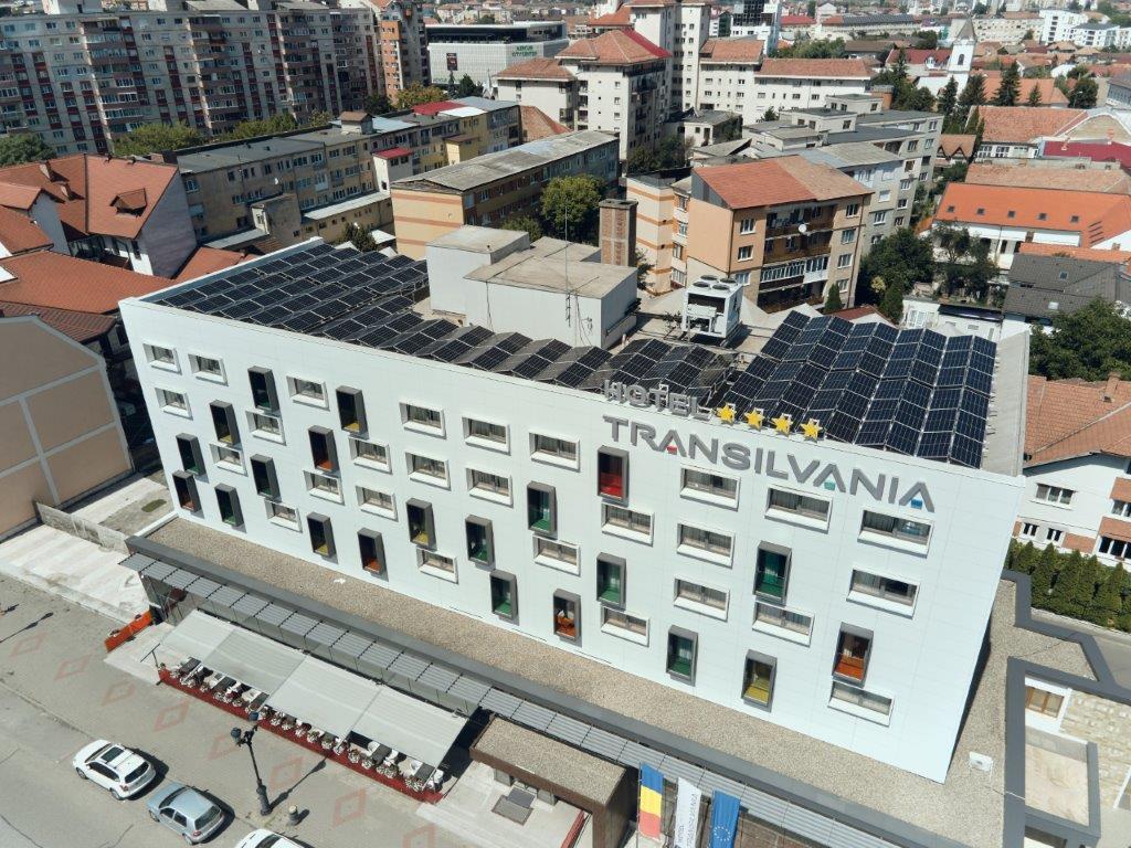 Industria hotelieră este o mare consumatoare de energie, datorită serviciilor pe care le oferă. Parcul fotovoltaic instalat pe Hotel Transilvania are o producție anulală de 81 MWh, ceea ce îi asigură o autonomie energetică de până la 40%. Panourile au fost instalate pe corpul principal al hotelului, pe o suprafață de 750 mp. Centrala fotovoltaică are în componență un total de 176 bucăți panouri fotovoltaice. Confortul oaspeților va fi menținut, deoarece toate dotările camerelor: minibar, televizoare smart, sistem climatic personalizat etc, vor funcționa la același randament optim.