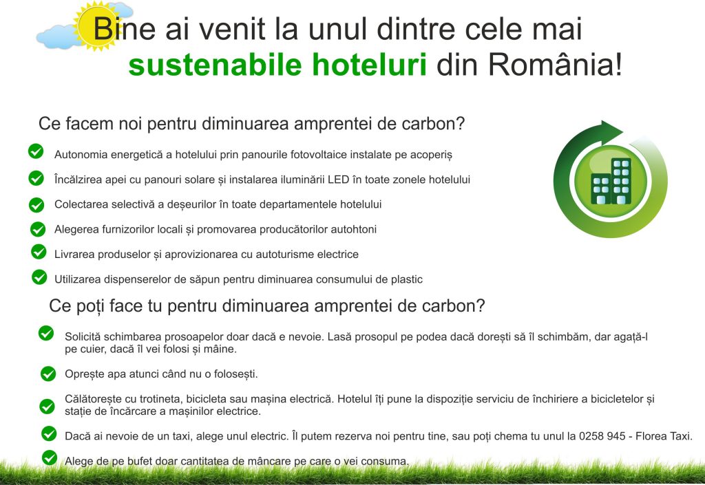 Practicile de management al mediului au fost implementate încă din faza renovării hotelului, în 2013, când acesta a fost achiziționat de către Florea Grup. Sistemul climatic personalizat disponibil în toate camerele de 4* asigură eficiența încălzirii și răcirii camerelor. Sistemul se decuplează automat dacă un geam nu este închis complet. Iluminarea se face integral cu becuri LED, care asigură o diminuare a consumului de energie cu peste 15%. De asemenea, apa caldă menajeră este încălzită cu ajutorul panourilor solare.